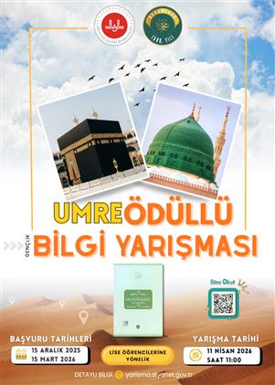 - 2026 Yılı Umre Ödüllü Gençlik Bilgi Yarışması 2025 yılı Mevlidi Nebi Haftası “Doğumunun 1500. Yılında Alemlere Rahmet Hz. Muhammed (s.a.s)” teması çerçevesinde gerçekleştirilecektir.